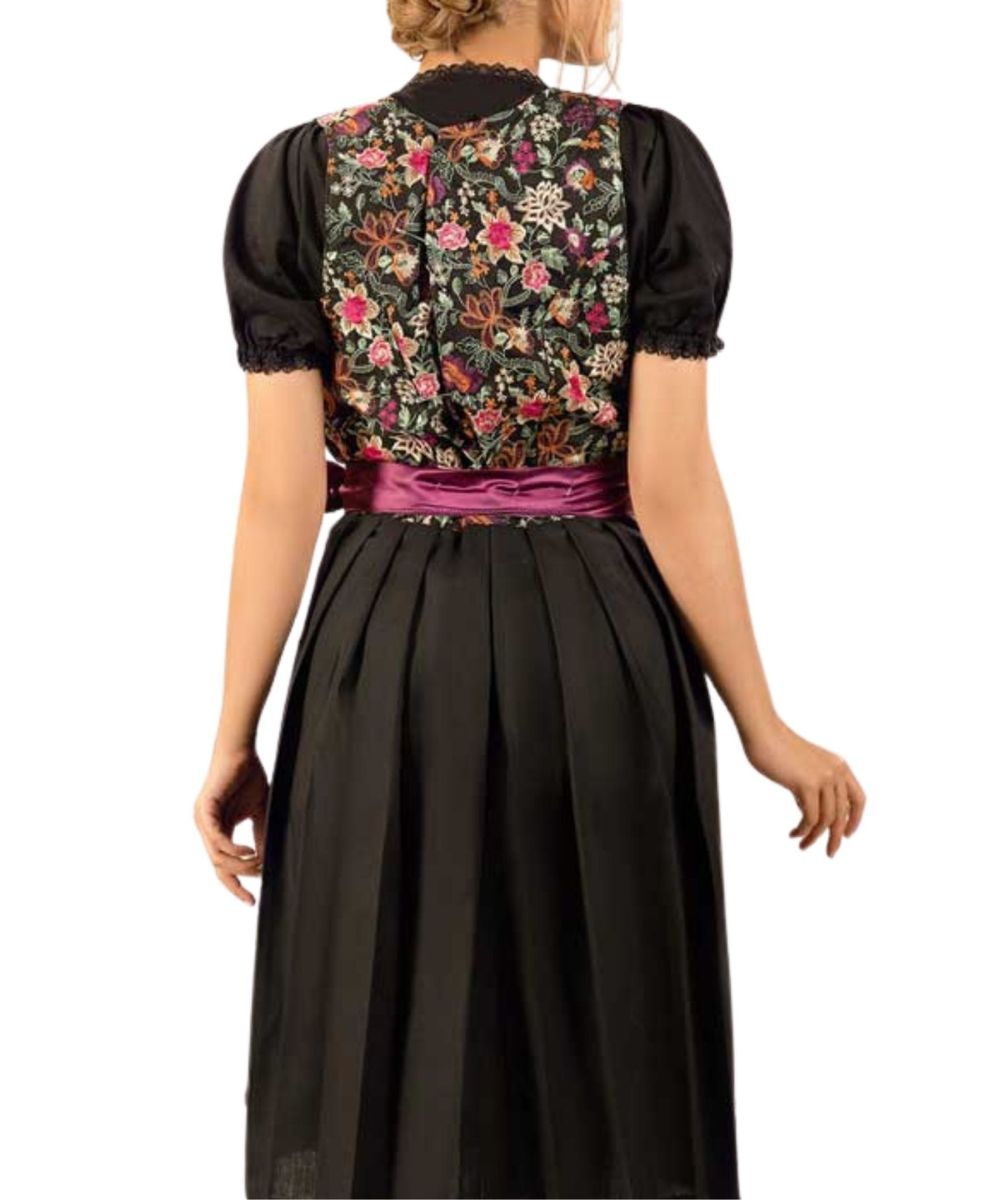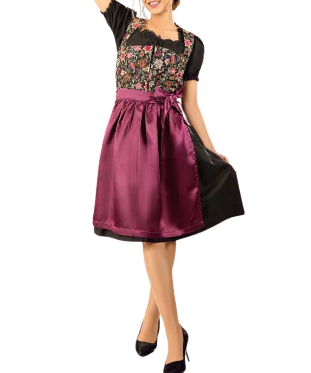 Introducing the Leonie Purple Bavarian Dirndl, a stunning fusion of traditional Bavarian design and modern elegance. This beautiful dirndl features a floral-embroidered bodice with a contrasting deep purple satin apron that ties at the waist, creating a flattering silhouette. The classic black skirt falls just below the knee, making it a versatile and timeless choice for any festive occasion.